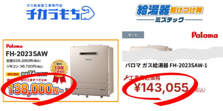 追い炊き機能付きの風呂給湯器の場合、他メーカーより約2万円も安い。